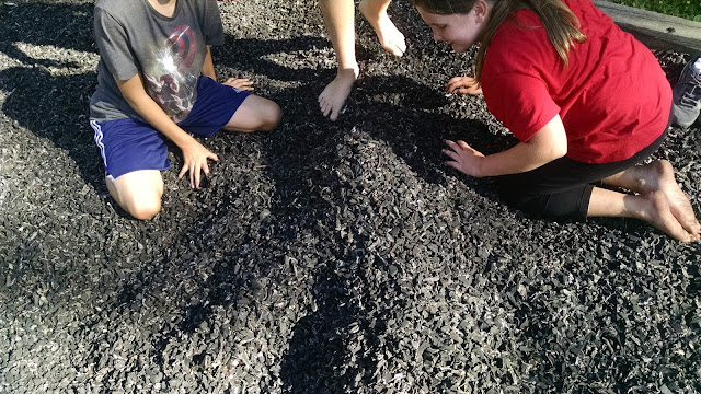 Playground at the park has recycled tire chips instead of wood chips. Kiddos thought it would be fun to bury each other in it. Everyone got really dirty and nasty but it was a lot of fun!